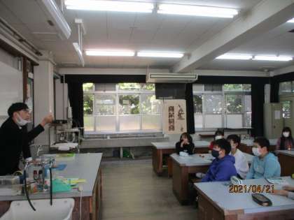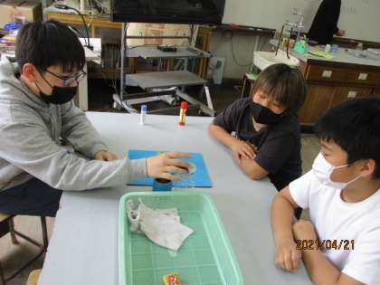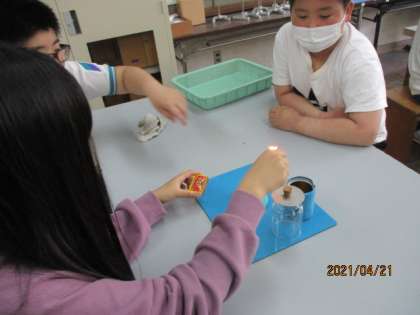 ろうそくに火をつけて,びんをかぶせ,ふたをすると,火が消えるのはなぜだろう…。予想をして,実験を行いました。いろいろな予想が出て,おもしろかったですね。たくさんの意見が出ることがとてもうれしいです。