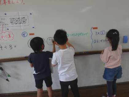 算数の時間,自分の力で「なんとか問題を解いてやろう!」と,一生懸命考えることができている子が増えてきました。この日は「わり算はかけ算を使うとかんたんに答えを求めることができる」ということに気付くこどができました。