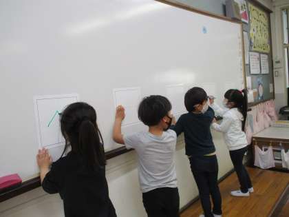 時間があったので,「今までに習った平仮名や数字を書き順通りに正しく書けるかな?」ということで,白板に書きにきてもらいました。みんな正しく書くことができていました♪