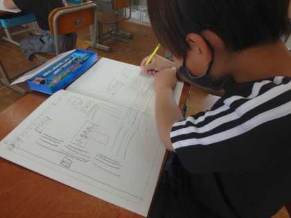 教室に戻った後は校区で見つけたことを地図に表しました。もちろん,人によって描く地図は違うのですが…それが次回の学習につながっていきます。