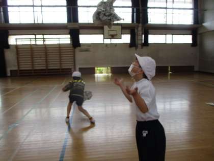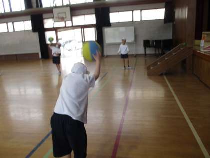 また,友達と二人一組になってボールをパスしあう運動では,ボールを高い位置からバウンドさせて上手に渡していました。