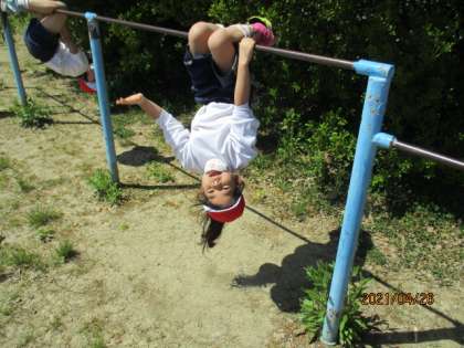 鉄棒ではどんな技ができるのかをそれぞれで試してみました。