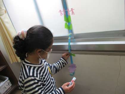 図工の「ちょきちょきかざり」の学習では,この前作った様々な形の折り紙を紙テープに貼りつけ,自分だけの素敵な飾りを作りました。みんな黙々と作っていました!!