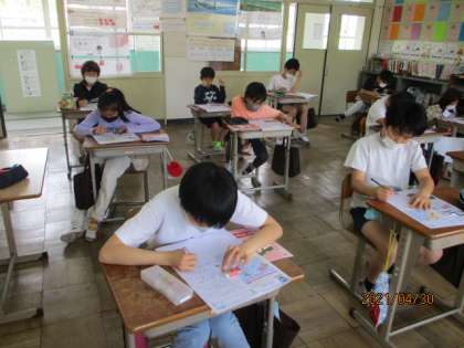 今回のテストは,今までの生活の中で聞いたことがないような内容がたくさん出題されるため,非常に難しかったようですが,子ども達の中には前日に復習をして『テスト勉強』をしてきた子もおり,最後までよく頑張っていました。