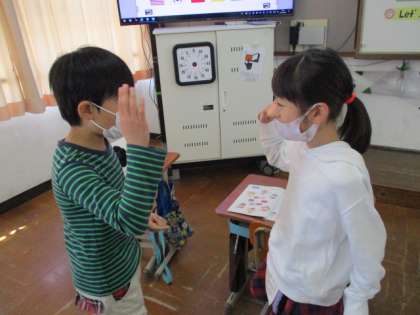 最初はいろんな国のあいさつを学習し、そのあと実際に英語を使ったあいさつを友達しました。
