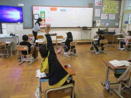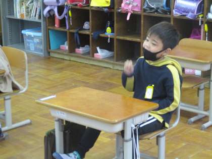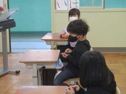 音楽で,「名前よび遊び」に挑戦しました。「〇〇さん」と呼ばれたら,カスタネットでリズムを打ちながら「はあい」と返事をします。みんなリズムもばっちり!!