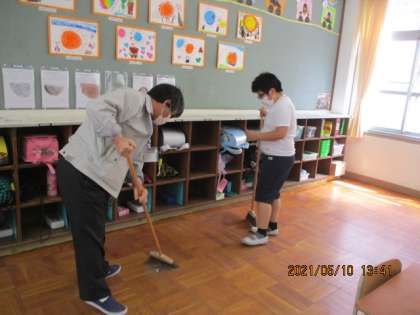 掃除場所が今日から変更です。1年生に掃除を教える人,わたりろうか,教室…任された場所でしっかりと取り組む姿をみることができました。そういう姿はとてもかっこいいです!