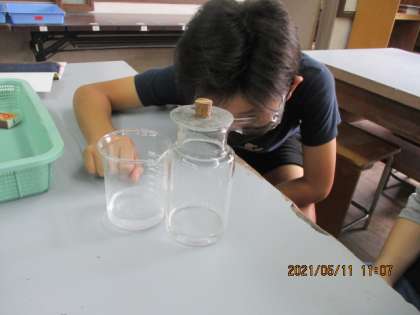 理科の学習では,燃やす前と燃やした後の空気を石灰水を使って調べました。燃やした後の空気では石灰水が白くにごりました。