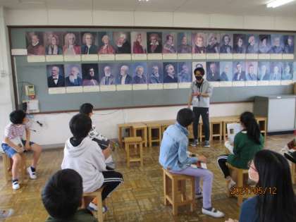 作曲したモーツアルトさんについても齊藤先生からいろいろ教えていただき,子ども達は作曲者にも興味をもっていました。