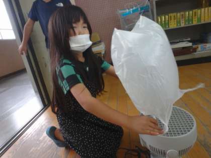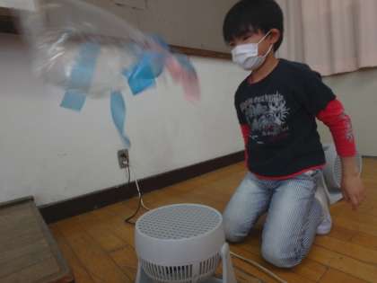 袋に材料を付け,風に乗せてをくり返しながら,自分のイメージに合うように作品を仕上げていきました。