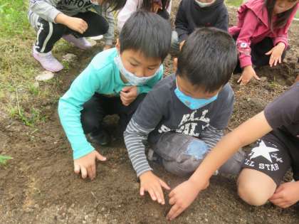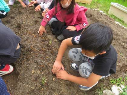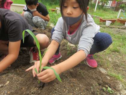 子ども達は意気揚々と楽しんで苗を片手に地面を掘ってました。