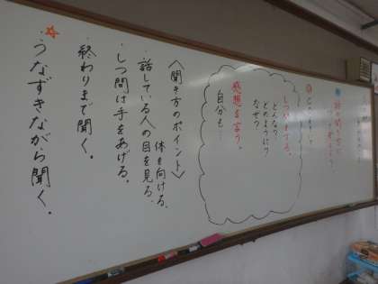 あるクラスのトークタイムの様子のCDを聞きながら,どのような話の聞き方がよいのかを考えました。子どもたちはよく聞き取ることができており,質問の中にも「どのように?」「どんな?」「なぜ?」を尋ねる質問があることに気付くことができました。