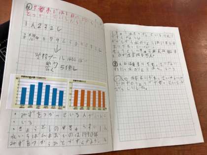また、1日あたりの京都市の給水量や給水人口のグラフの資料から読み取れることを出し合いました。