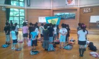 *プレイホール(体育館)で入所式を行いました。「所員の方々,3日間よろしくお願いします。」と代表の挨拶。(バッチリでした!)また,思いを込めて「小栗栖小の旗(児童会旗)」を歌と共に掲揚しました。この旗のもと,野外活動を思う存分楽しみましょう。