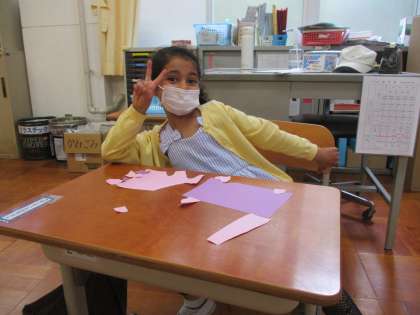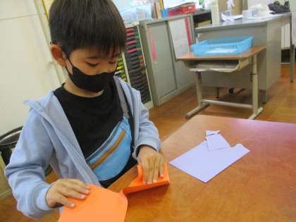 図工では,紙をやぶいて組み合わせ,「どんな形にみえるかな??」と作品を作っています。まずは,好きに紙をやぶいていきます。