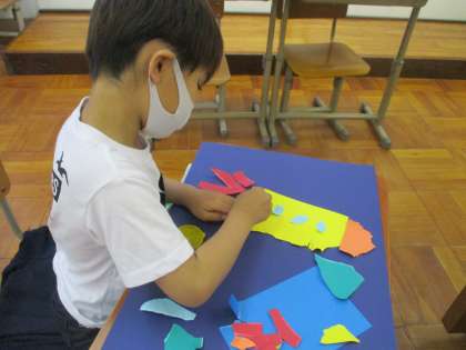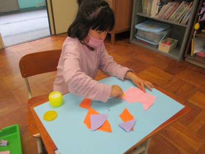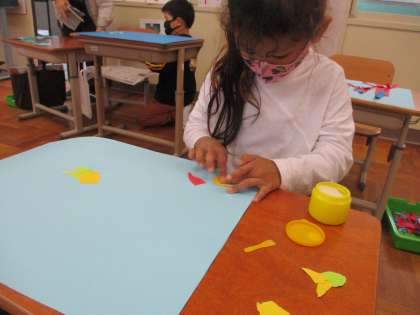 やぶった紙を組み合わせて,「魚の形に見えた!」「ロケットの形に見えた!」など,何を作るか決まってきたようです♪