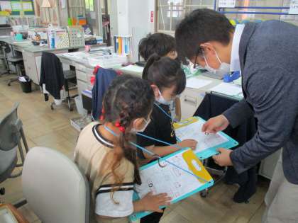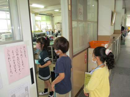 職員室ミッション「しつれいします。1年1組〇〇です。見学に来ました。」と名前や要件を言う。クリア!!