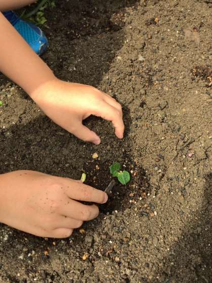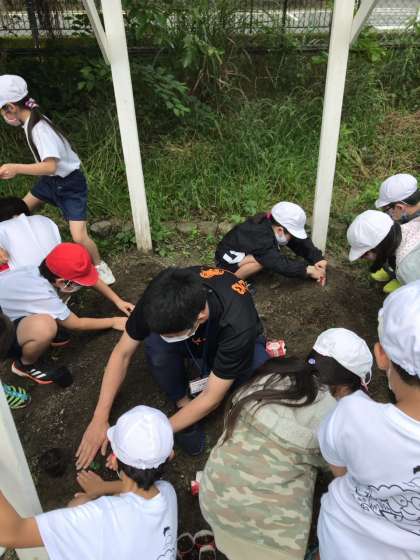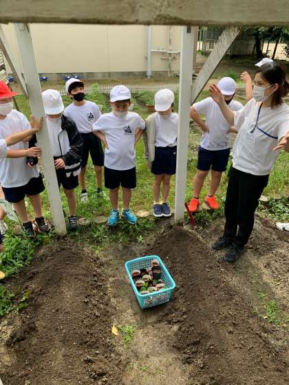 理科の学習で教室で育ててきたツルレイシを畑にうつしました。