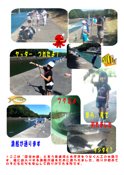 *ほとんど釣りをしたことがないみんながチャレンジしました。えさをつけることや竿(さお)の持ち方も今回初めて教わりました。少しでも上手になろうと,実は学校のプールで特訓をしました。