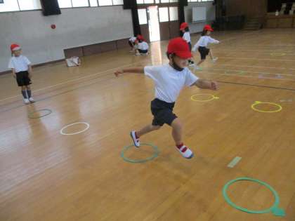 ケンステップを使った跳び遊びをしました。遠く跳ぶことに挑戦したり,ケンケンパに挑戦したりしながら,楽しむことができました。