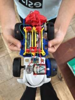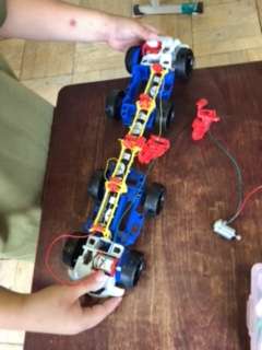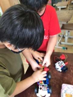 豆電球をつけてみたり、友達と合わせて2台合体させてもっと速い車が作れないかと試行錯誤をしている人もいました。