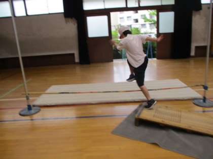 バーにかからないように跳ぶのはなかなか難しいですが,ふみきり板を使うことでちょっとコツが分かってきたようです!