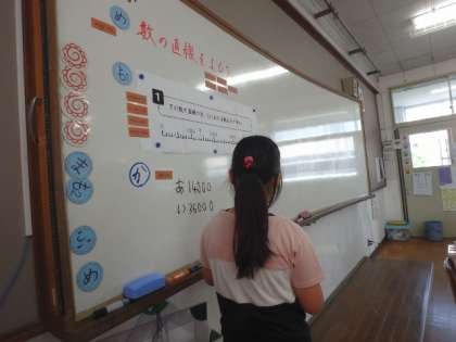 この日は数直線を読む学習をしました。みんなで話し合う中で「1めもりの大きさを考える」ということにはすぐに気付くことができたのですが,「1000万が10こで1億」や「100万が10こで1000万」という数の仕組みを理解できていない子が多いようでした。位の表や具体物を使って,しっかりと理解できるようにしたいと思います!