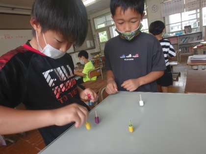 この間作った手作りごまが,クラスで一大ブームになっています。作るのもとっても上手になり,回すのもとっても上手です!