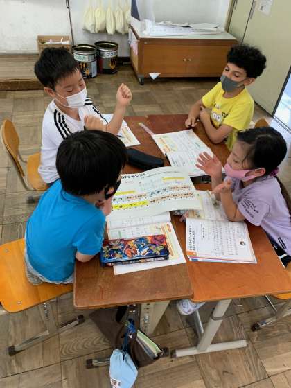 「おまつり」の言葉のリズムや組み合わせを工夫してリズムアンサンブルをつくりました。