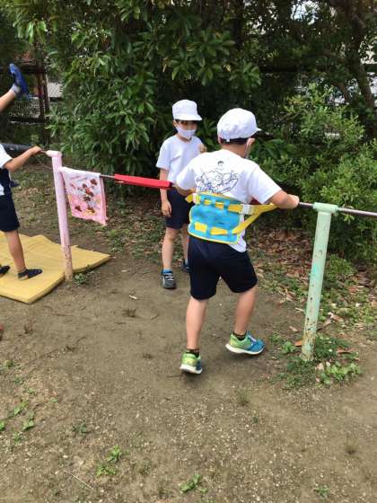 逆上がりなどの技を,技カードを見たりしてお互いにアドバイスし合っていました。