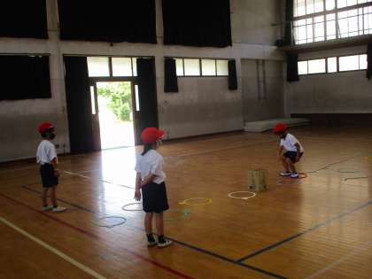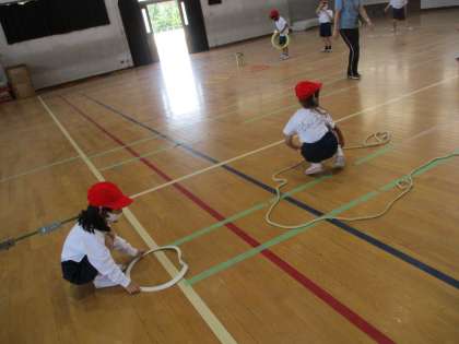 跳び遊びが,最終でした。今まで,ゴム・ケンステップ・箱・大縄など,様々な道具を使って跳び遊びをしてきたので,今日はそのまとめとして,どの道具を使ってもいいことにしました。子ども達なりの楽しいコースを作って,楽しんでいました。