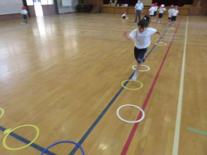 授業の後半の遠くへとぶ時間では,チームに分かれていろいろなコースを作って遊びました。