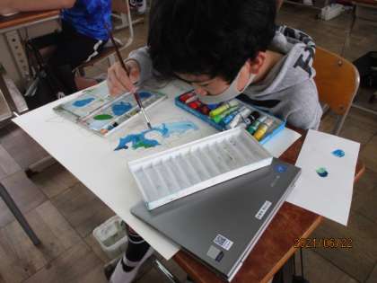 今日から色塗りに入りました。一生懸命に描いた下描きも色がつくことでさらにすてきな作品になりますね。最後まで自分の作品を大切にしながら頑張りましょう!