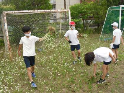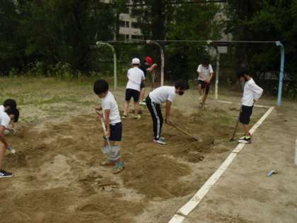 体育で走り幅跳びの学習をしようと思っていると,小栗栖小学校の砂場はカッチカチで,砂場の前は雑草が伸び放題になっていました。