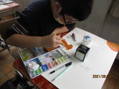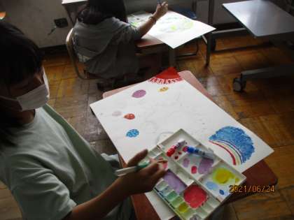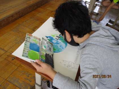 一つひとつを丁寧に塗る姿がとてもすてきです!「どうしてここにこれを描いたの?」と尋ねると,しっかりと自分の思いを語ってくれます。