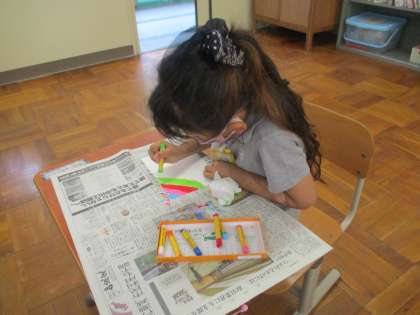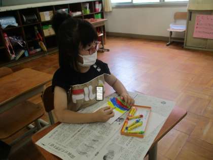 クレパスを使って,絵を描きました。まずは,自分の好きな色をしっかり紙全体に塗っていき,その上から黒いクレパスで真っ黒に塗ります。
