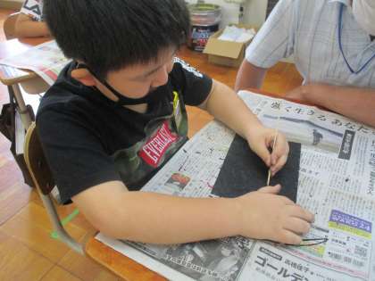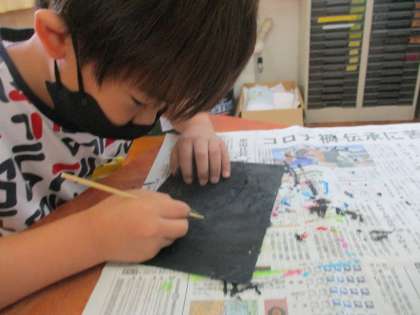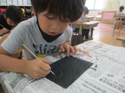 出来上がった黒色の紙を竹串でこすると…あら不思議!