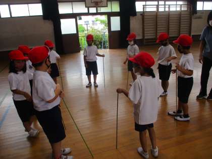 今日の用具遊びでは,皆で協力をして,隣の友達の棒を落ちる前に取ることに挑戦しました。最後には,全員成功で「わ〜!!」と歓声が上がりました。