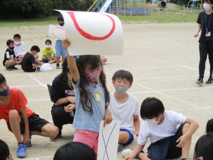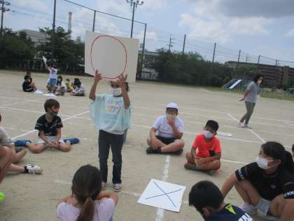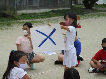 グループのお兄さん・お姉さんに答えを教えてもらいながら,〇×カードをだしていました。