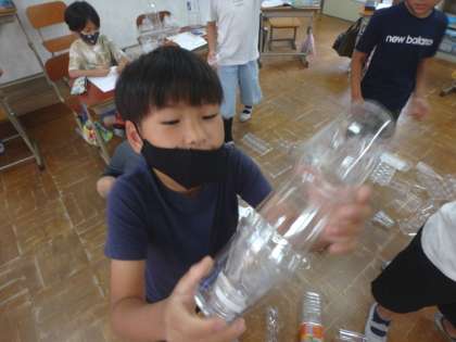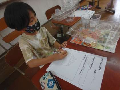 プリンのカップやペットボトル等の,透明の材料を使って,生き物を作っていきます。まずは材料を見ながら,自分の作りたいもののアイデアスケッチをしました。