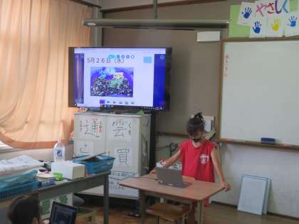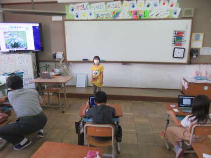 生活ではタブレットを使ってして自分たちのミニトマトの一ヶ月の様子や気付いた事を発表しました。