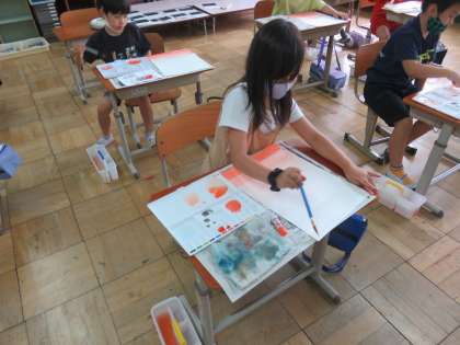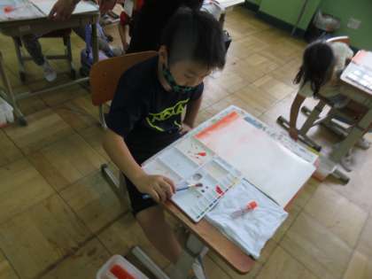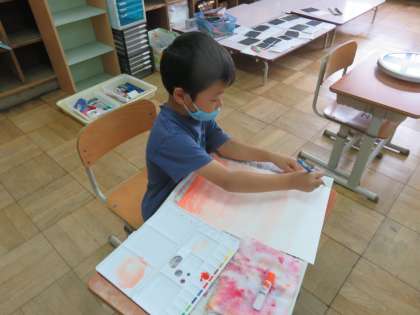 今日の図工は絵の具セットを使って,1色でグラデーションを作る学習をしました。