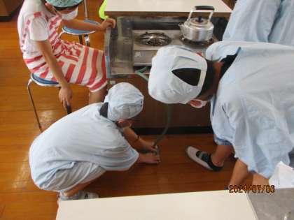 ガスコンロの使い方を確認し,お茶の量と水の量を班で分担して量り,やかんを火にかけました。