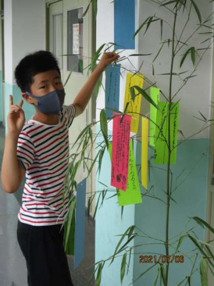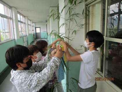 5年生でも,一人一人が短冊に願いを書いて笹の葉に結びつけました。