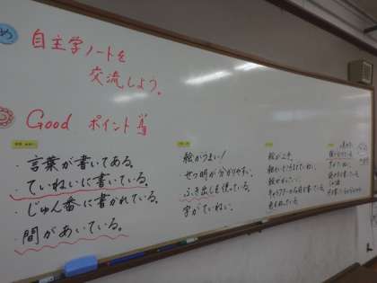 友達の自主学ノートを見て,すてきなところを交流しました。「丁寧な字で書いている」「間を空けて書いていると見やすい!」と,たくさんの気付きがありました。少しずつ自分のノートをレベルアップさせていきたいですね!