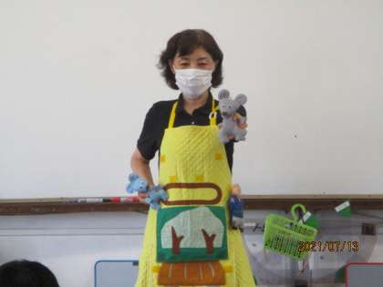 手作りのエプロンから続々と登場する人形やしかけに,子ども達はどんどん引き込まれとっても楽しい読み聞かせの時間となりました♪