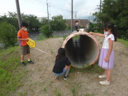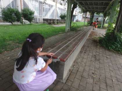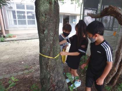 運動場にある様々なものの長さを,巻尺を使って測りました。