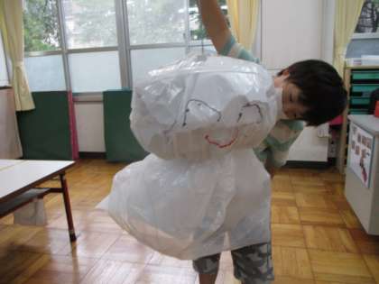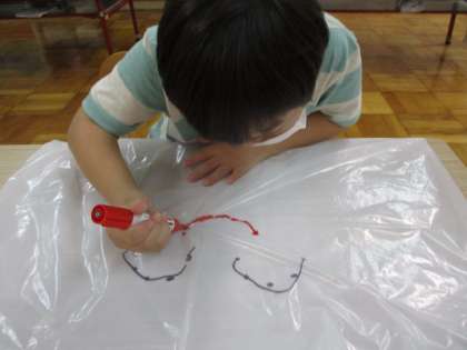 ニコニコの顔を描き,中に新聞紙を詰め,好きな色のひもを選んでしばって完成!