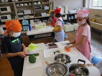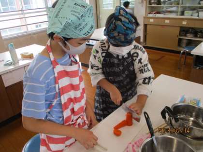 家でお家の人と料理をした経験のある子も何人かいたので,その子が各班の中心になりながら,事前に学習した通りに野菜を切ったり,鍋でゆでたりしていました。