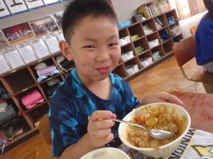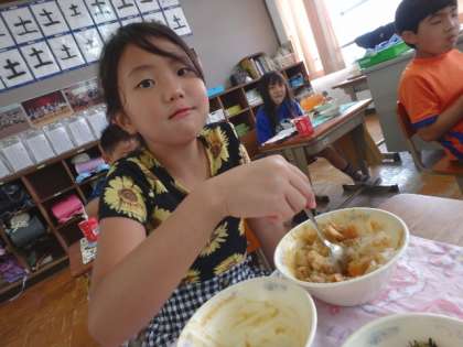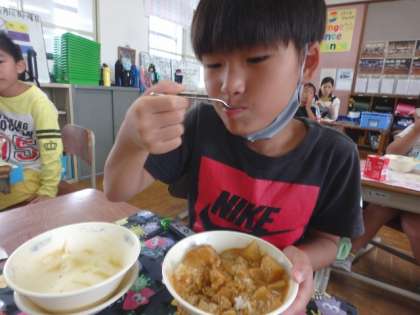 この日の給食は,チキンカレーとひじきのソテーでした。カレー好きな担任のために,「7月16日はカレーやで!」と伝えてくれていた子どもたち!